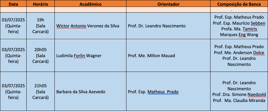 Conforme explica o coordenador de curso, Prof. Dr. Leandro Nascimento, divulgar com antecedência o calendário de bancas é uma forma de o curso atuar na vanguarda e com antecedência, conferindo aos discentes a visão sistêmica sobre o percurso que precisam conduzir e os prazos a serem cumpridos. Esta é a primeira turma do curso que apresentará o TCC e, em agosto, participam da cerimônia de colação de grau: