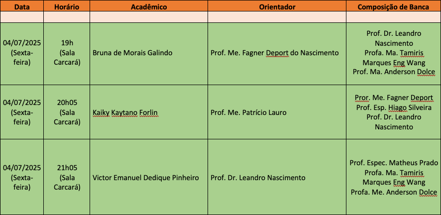 Embora o calendário de bancas inicie apenas em julho, é preciso estar atento aos prazos, visto que, conforme o calendário letivo, o prazo para protocolar a versão final do TCC é de 16 a 18 de junho, junto à coordenação de curso, seguindo as orientações do Regulamento.